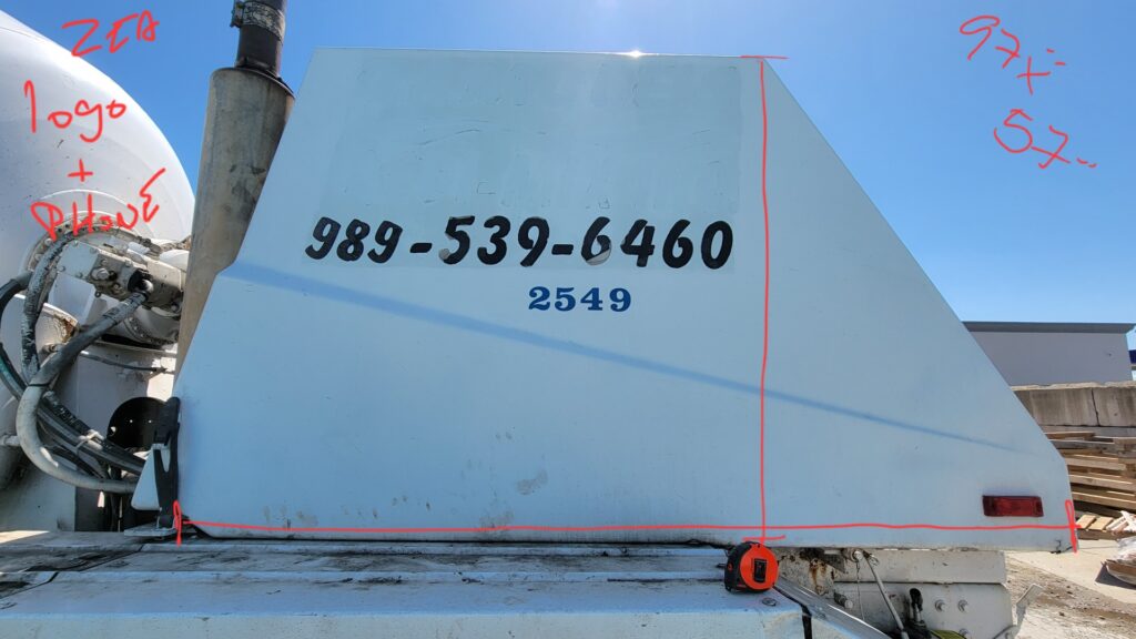 Cement truck with dimensions for vinyl graphics written on the photograph