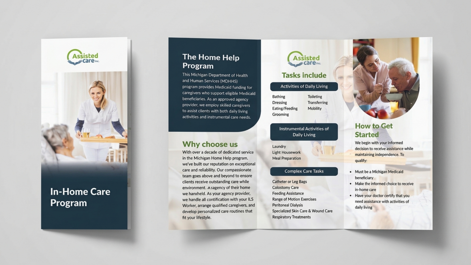 We built a comprehensive brand guide that gave Assisted Care a system. Color palette, typography, usage rules, file formats for every application – everything packaged so any printer or vendor could produce on-brand materials without guessing. We also designed their business cards, tri-fold brochures, and all their other day-to-day collateral. Their team now had something professional and tangible to hand referral sources at meetings.