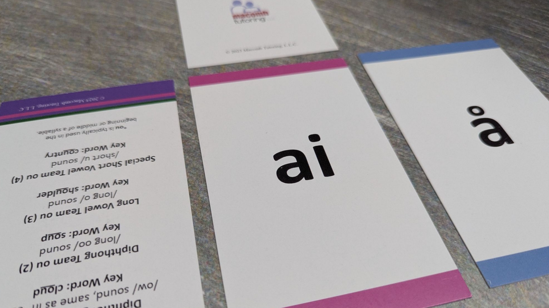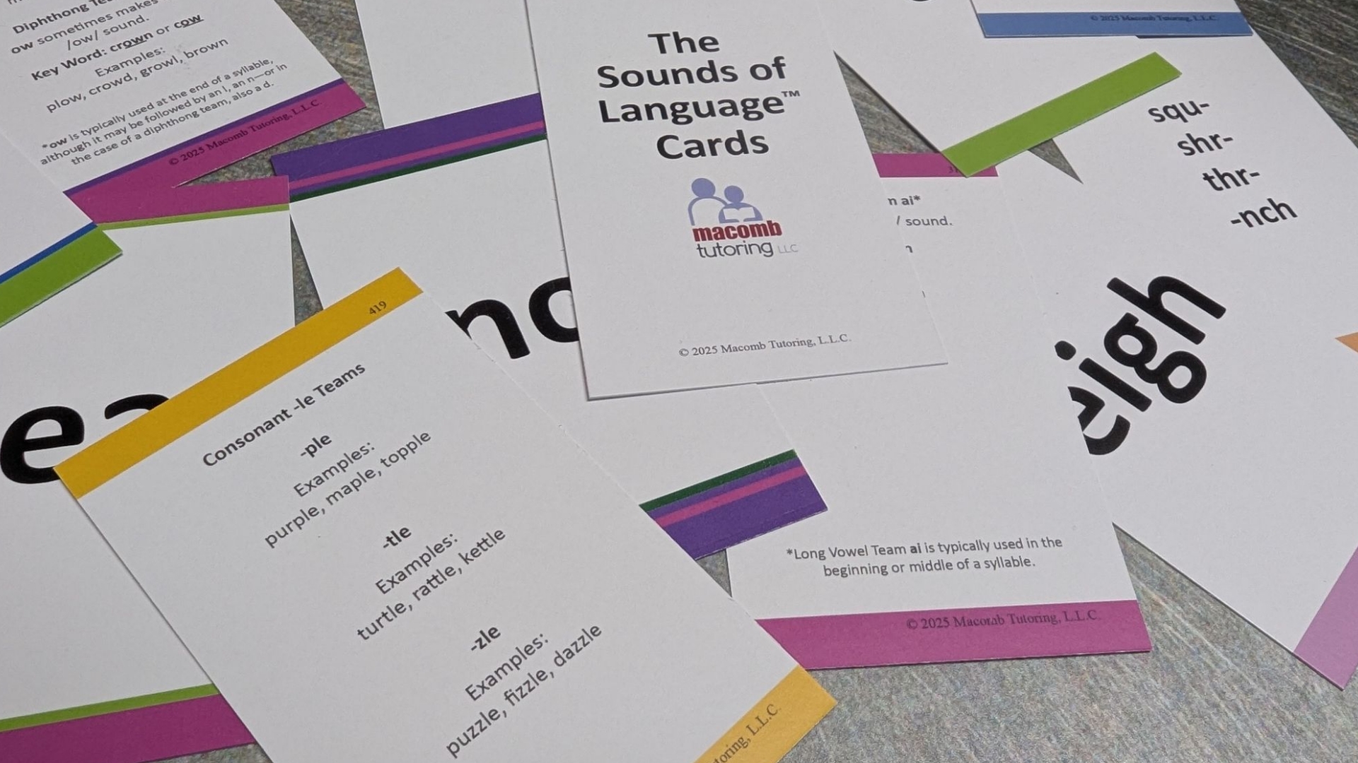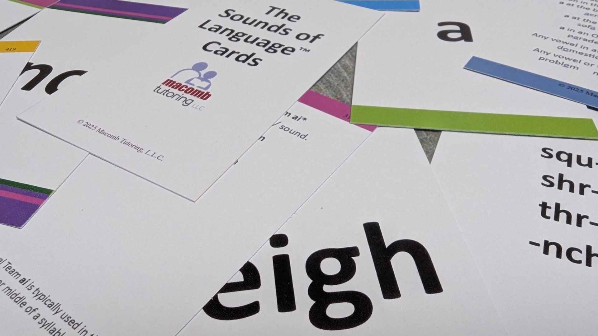 The Sounds of Language™ Cards are a real, printed, color-coded card system that tutors can pull from during sessions and students can reference on their own. They’re durable. They’re organized. They look like a product you’d find on a shelf, not something printed in a home office.